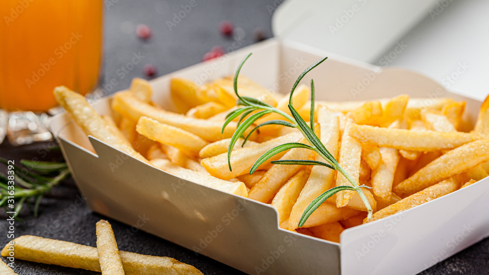 Fast food delivery concept. Fried fries in a white box of eco paper. A glass of lemonade. background image, copy space text