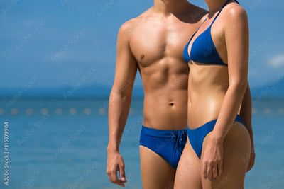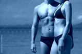 Young sports couple on Tropical Beach. Fashion Photo Shoot.