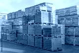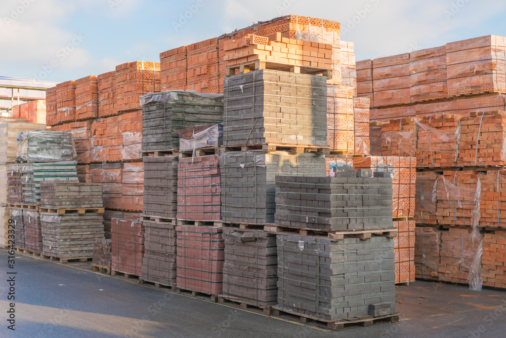 pallets with bricks in the building store. Racks with brick. Masonry, stonework. Several pallets with concrete brick stacked on top of each other in depot. new bricks on pallets