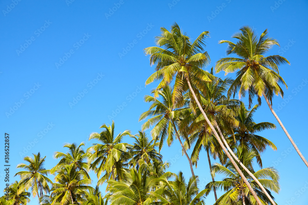 Coconut palm trees against the blue sky