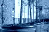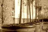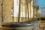 Very large, ornate tree pots seen with saplings growing outside newly built luxury apartments in late winter. Part of a large, exclusive apartment development.