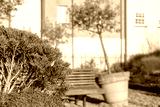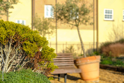 Shallow focus of an ornate evergreen bush seen outside newly built, luxury apartments. A large terracotta pot with an ornate tree is leaning after a recent storm and strong winds.