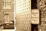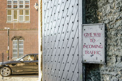 Old Give Way sign seen at the exit to a famous private school. The large, medieval doors open to a narrow, one way street with a car seen passing.