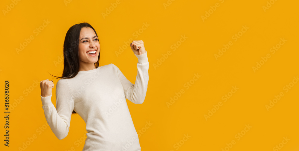 Euphoric brunette woman celebrating success with raised fists over yellow background