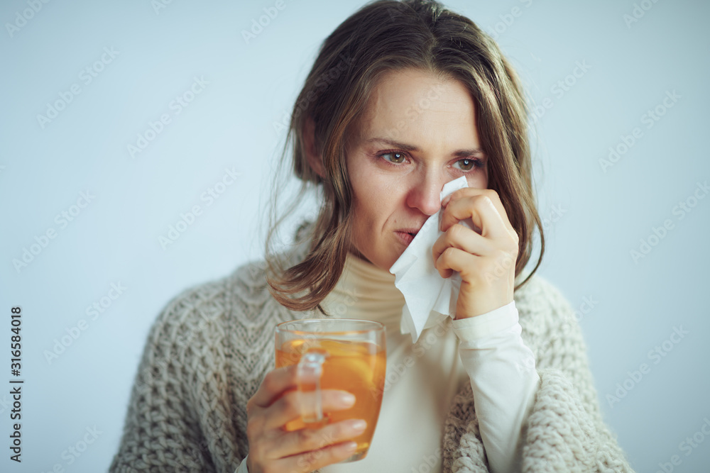 woman holding cup of tea on winter light blue background