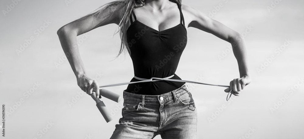 Girl with perfect waist with a jump rope in hands. Athletic slim woman measuring her waist by measure tape after diet. Fit fitness girl measuring her waistline with measure tape. Black and white