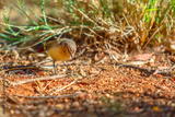 The brown thornbill, Acanthiza pusilla, a passerine bird, resting on the ground in the undergrowth. Desert Park at Alice Springs, MacDonnell Ranges in Northern Territory, Australia.
