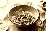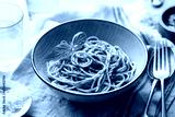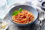Pasta, spaghetti with tomato sauce and fresh basil in a bowl. Grey background. Close up.