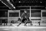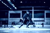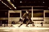 Strong Caucasian hockey player in red uniform with helmet skating to goal with stick and puck.