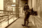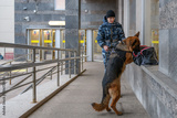 Female police officer with a trained german shepherd dog sniffs out drugs or bomb in luggage.
