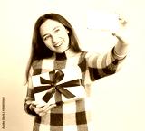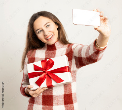 Selfie of happy young woman with gift box