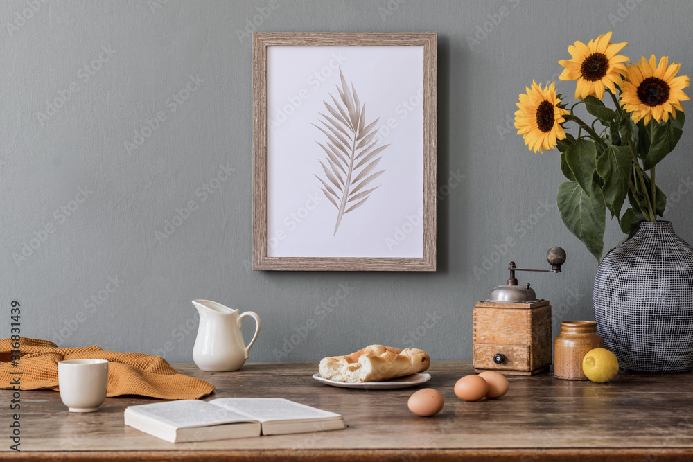 Stylish and sunny interior of kitchen space with wooden table, brown mock up photo frame, breakfast and sunflowers. Scandinavian home decor with kitchen accessories. Template. Gray color concept