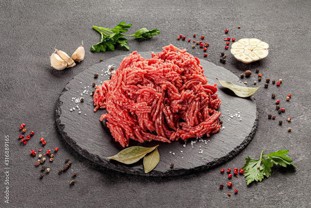 Raw meat products. Veal or mixed homemade minced meat with spices on a black background. board background image, copy space text