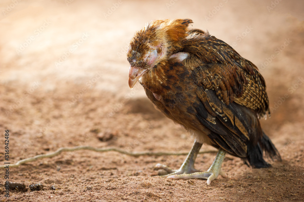 Sick chicken on the ground in farm. Copy space for text. The concept of Infectious diseases of chickens.