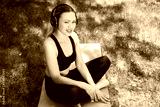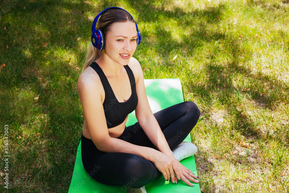 Beautiful girl in sportswear sitting on a green mat in the park. Doing yoga with headphones. Listens to music during sports