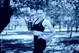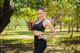 Beautiful girl in sportswear sitting on a green mat in the park with a glass of water. Doing yoga with headphones. Listens to music during sports