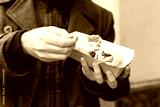 Close-up of man is holding falafel sandwich in paper bag. Healthy street food concept, oriental cuisine.