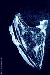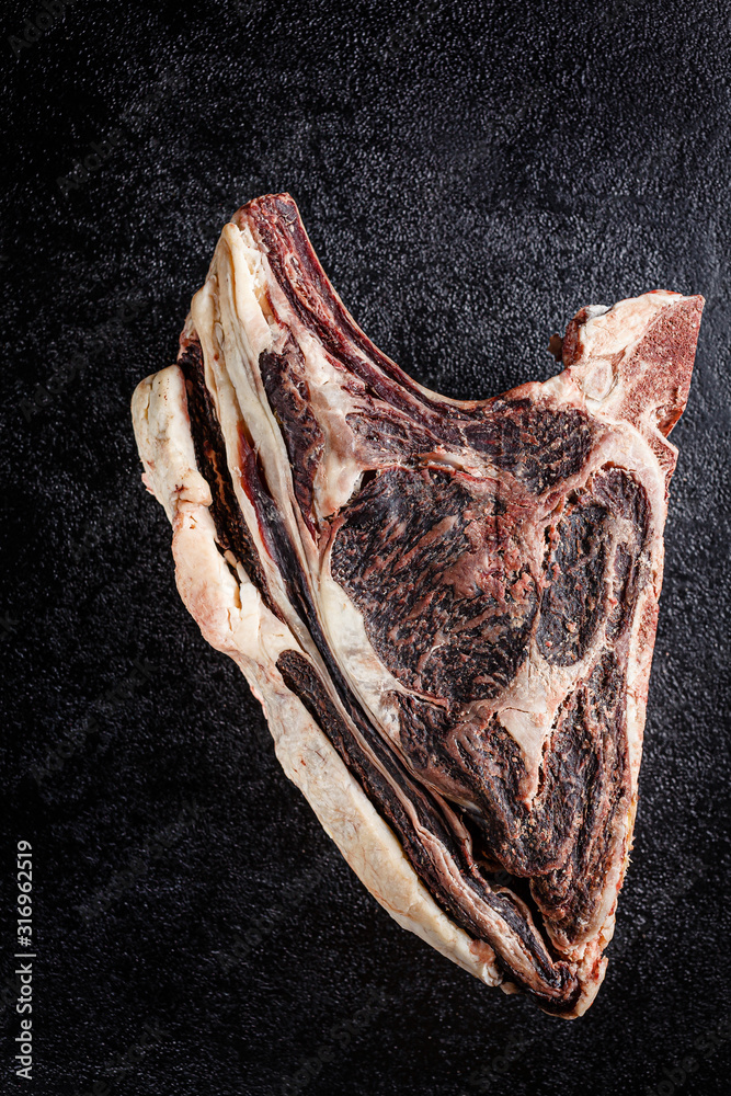 Modern kitchen. Dry aged beef, veal meat with red pepper and rosemary lies on a black background. board background image, copy space text, top view