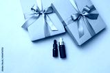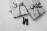 Pink gift box with ribbon and bow on blue background. Glass cosmetic bottle with dropper pipette.