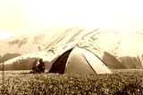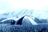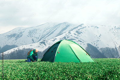 Tourist pitch a tent on green meadow in spring mountains. Amazing highland. Landscape photography