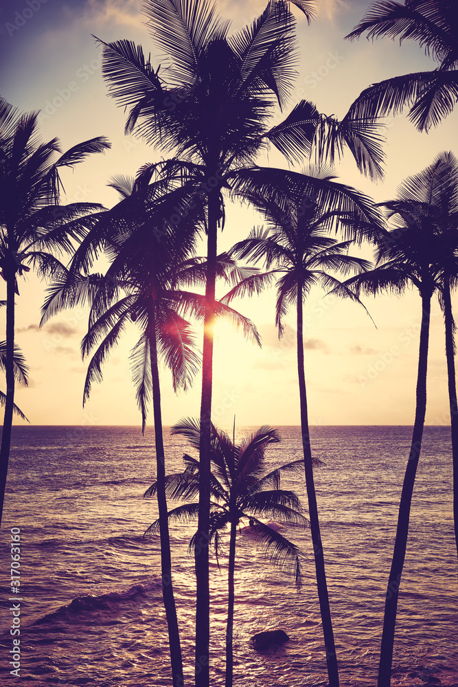 Coconut palm trees silhouettes at sunset, color toning applied.
