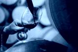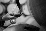 Close up image of a wine sample being collected by a wine maker in a cellar with old oak wine barrels