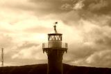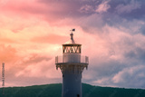 Close up of old white lighthouse tower with epic sunset sky on the background