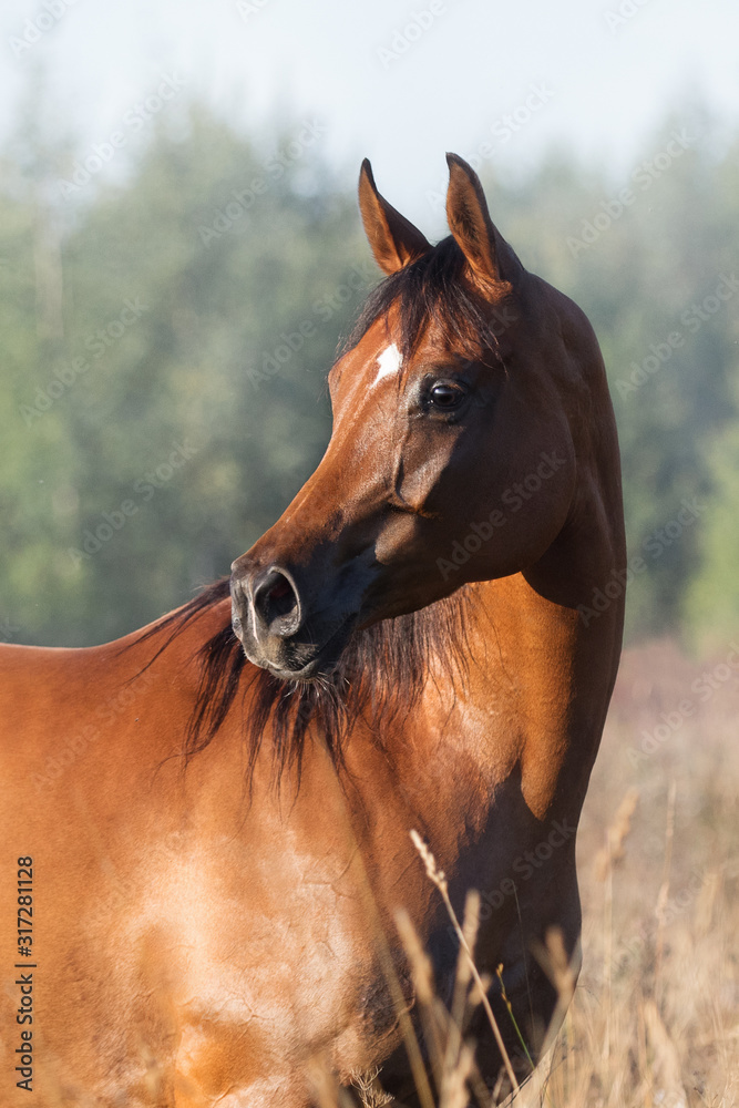 A chestnut arabian horse look back against summer background. Portrait closeup