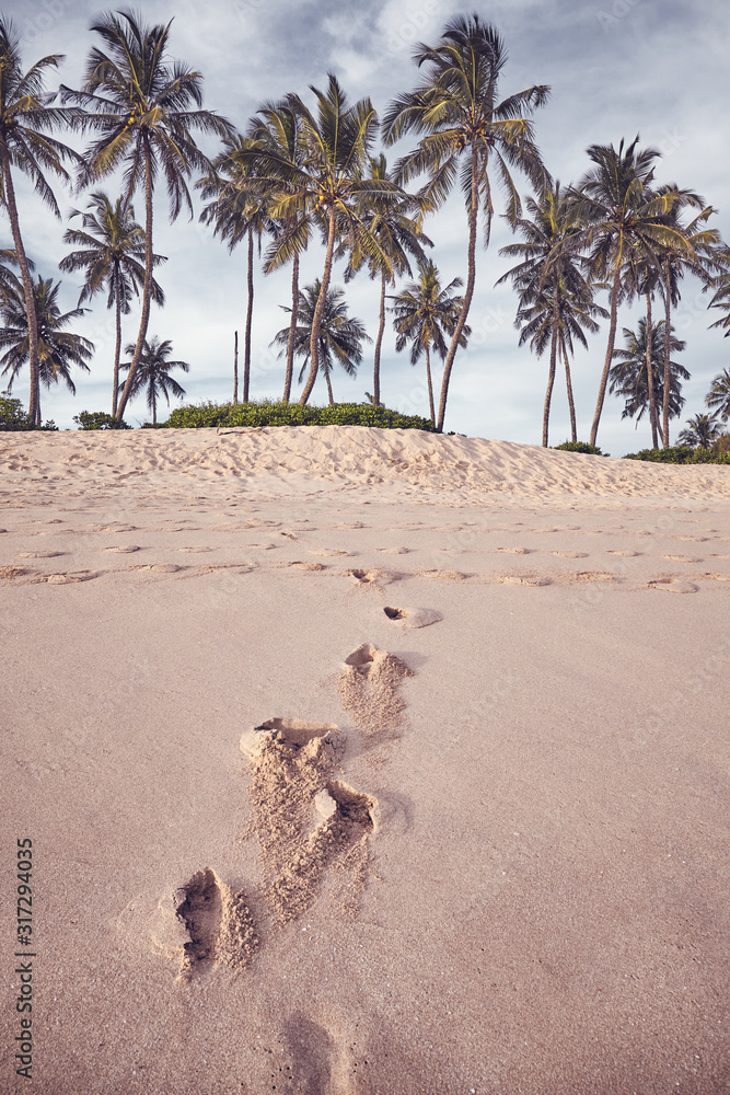 Coconut palm trees at a beach with footprints on sand, color toning applied.