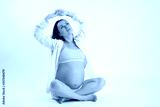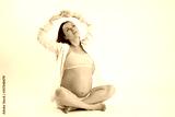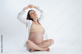 Pregnant young brunette woman in white shirt exercising while sitting on the ground, isolated over white background copyspace for your text