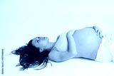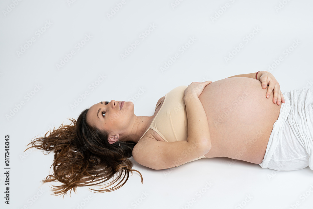 Young attractive pregnant female with loose hair lies on the ground and holds her hands on her swollen belly, isolated over white background