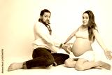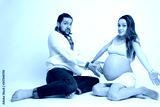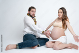 Young bewildered couple sitting on the ground with arms apart, handsome bearded man in white shirt and blue jeans and beautiful pregnant woman in beige bra