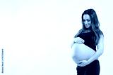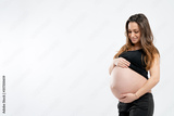 Waist up portrait of the beautiful brunette pregnant woman with loose hair, dressed in black casual clothes and holds her hands on her swollen belly, looking at it, isolated against white background