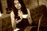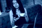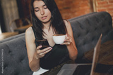 Business woman working on a laptop, using phone and drinking coffee in a cafe.