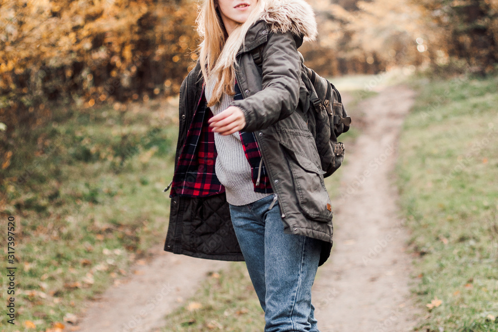 Hiking and travel along in the forest. Concept of trekking, adventure and seasonal vacation. Young woman walking in woods.