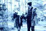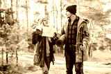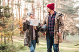 Travel couple with map, compass and backpack in the forest. Freedom and active travel concept.