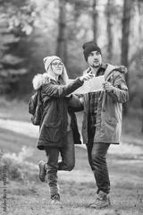 Travel couple with map, compass and backpack in the forest. Freedom and active travel concept.