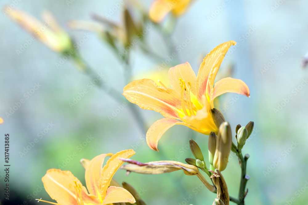 Yellow lily flowers in a summer garden on a bright sunny day close-up
