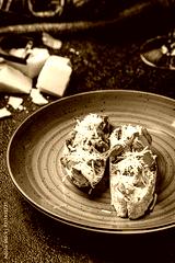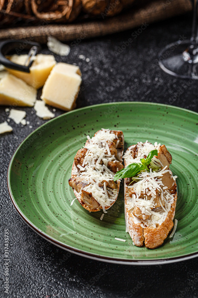 Italian Cuisine. Classic italian atipasta or tapas appetizer, baguette with mushrooms, parmesan and basil on a green plate. background image, copy space text