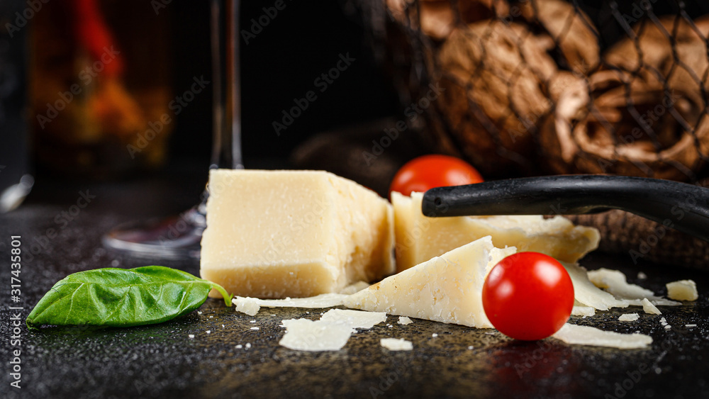 Italian Cuisine. Large pieces of Parmesan cheese, a cheese knife, cherry tomatoes and basil are on a black background. background image, copy space text
