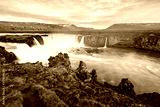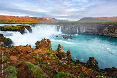 Colorful sunrise on Godafoss waterfall on Skjalfandafljot river, Iceland, Europe. Landscape photography