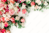 Flower pattern made of pink, beige roses flower buds on white background. Flat lay, top view.