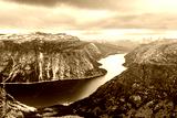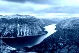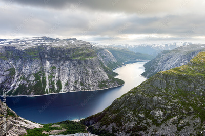 Breathtaking view on ringedalsvatnet lake from Trolltunga rock - most spectacular and famous scenic cliff in Norway. Landscape photography