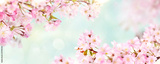 Pink cherry tree blossom flowers blooming in spring, Easter time and Mothers day, against a natural sunny blurred garden banner background of pale blue and white bokeh.