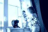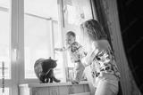 Happy young mother with baby and cat.