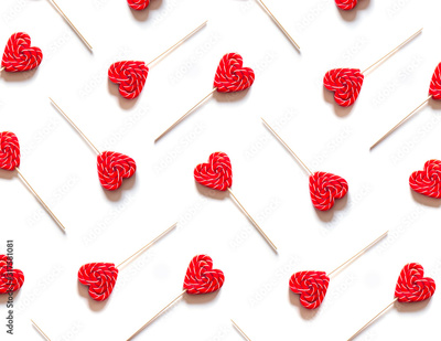 Heart shape red lollipops on the white seamless pattern . Valentine's day greeting card