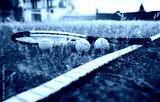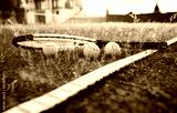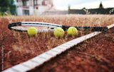 Ruined tennis court with a racket and balls. Sport, recreation concept