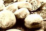 Carnival powdered sugar raised donuts with paper streamers. German berliner or krapfen for carnival