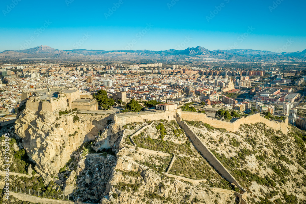 Aerial view of Santa Barbara castle ancient fortress with panoramic views in Alicante Spain