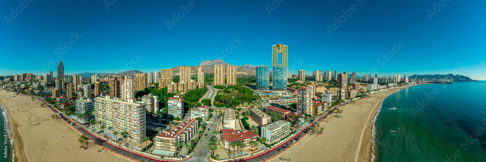 Aerial view of the popular Spanish Mediterranean beach resort town Benidorm with high rise complexes